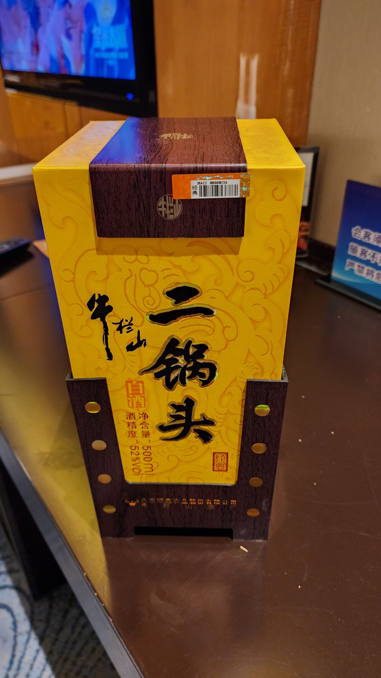 ได้มาขวดสวยเป็นเซรามิค ทรงน้ำเต้าที่สีเหลืองมีลวดลายแบบสวยงาม ตกประมาณ3-4 ร้อยหยวนผมจำไม่ได้ อยู่ในกล่องแพ็คดีเกิน สารภาพ ผมเปิดไม่เป็นไม่รู้แกะกล่องยังไงแน่นเกิน ใช้เวลาอยู่นานมาก สรุปผมใช้ ด้ามช้อนกาแฟทิ่มให้ขาด แล้วเอาออก ผมมาเช็คทาง Chat GPT ชื่อว่า เหล้า หนิว หลาน ซาน เอ้อร์ กัว โถว