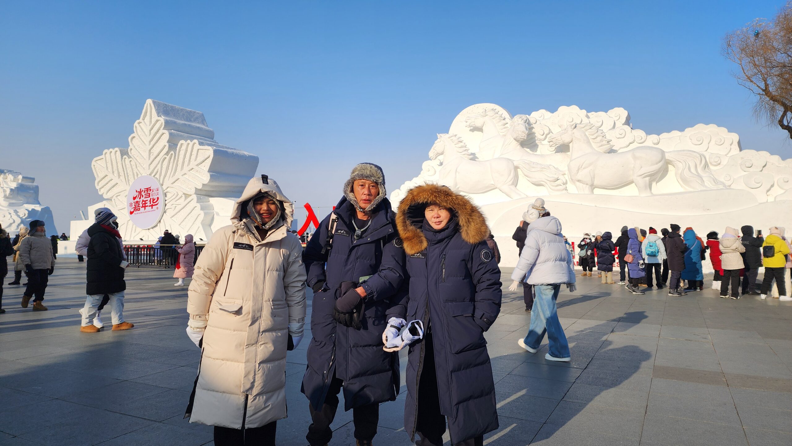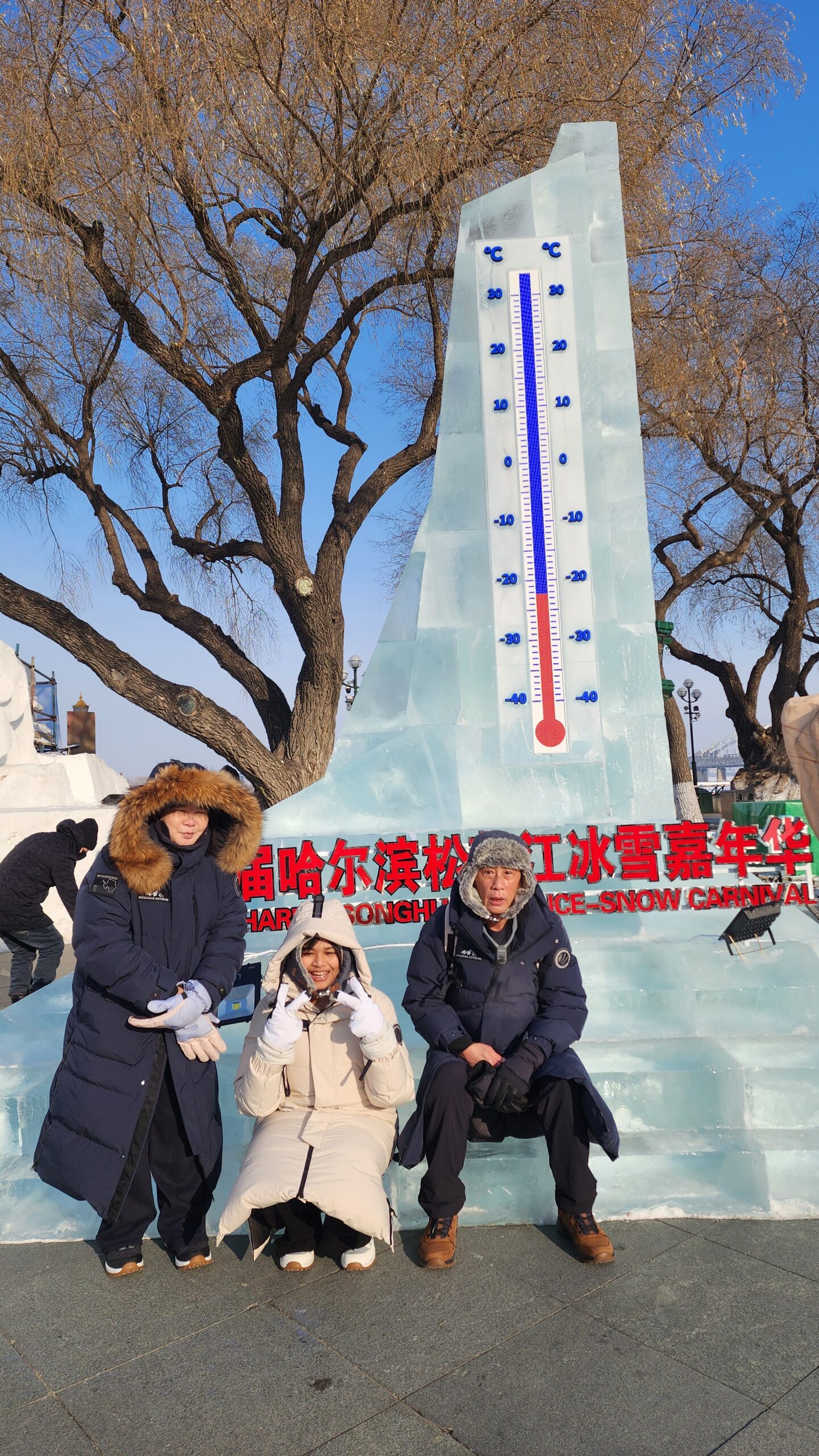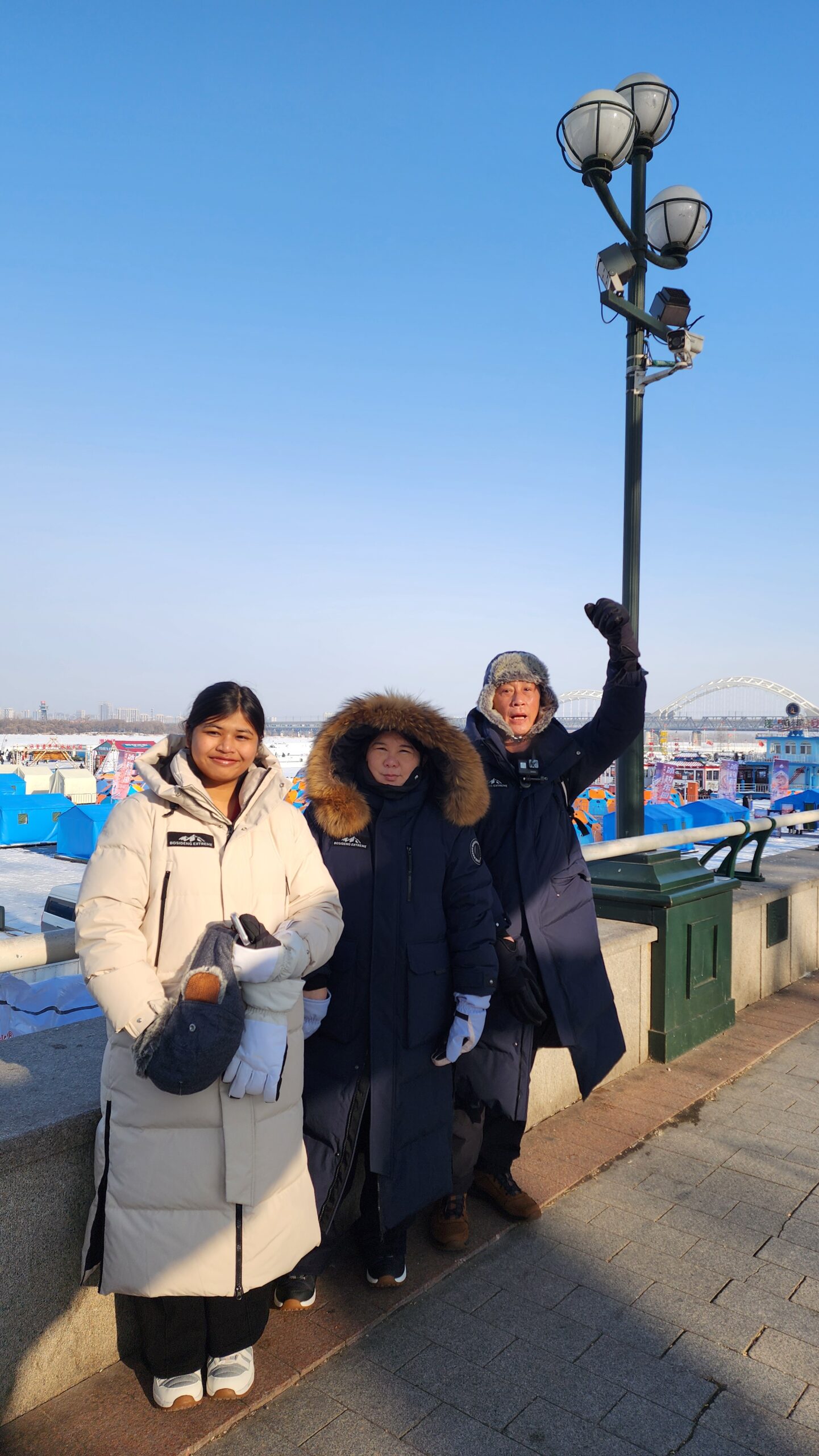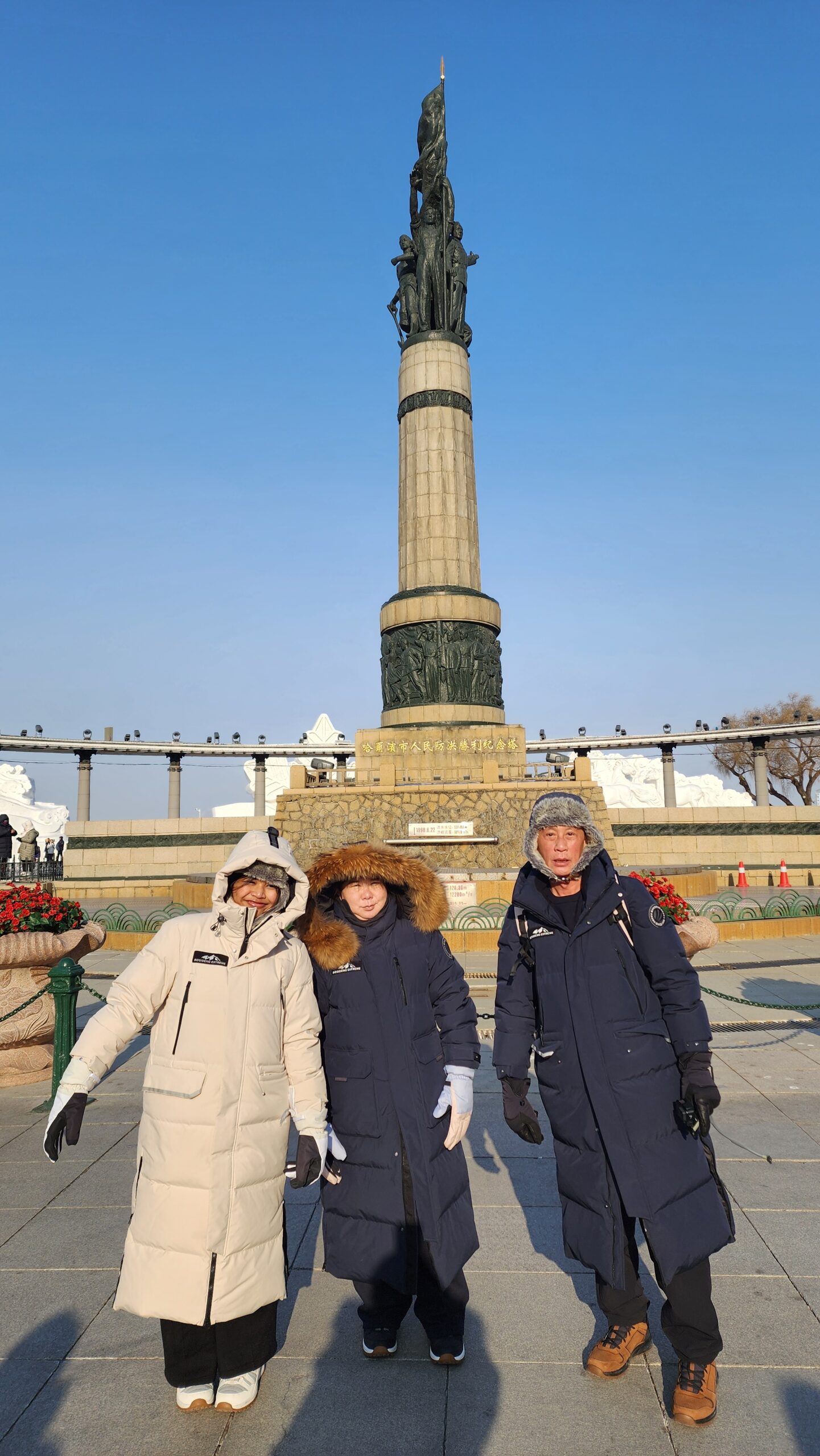 จุดต่อไปที่ต้องเห็น แม่น้ำซงฮัวเจียง (Songhua River) ไกด์ให้รายละเอียดหน้าหนาวพื้นผิวจะเป็นน้ำแข็งหนามาก สามารถลงไปทำกิจกรรมได้ผมเห็นเป็นลานให้นักท่องเที่ยวลงเดินเล่นเหมือนสนามกีฬาดูน่าสนุก ตามเอกสารนำเที่ยวแจ้งว่า จุดนั้นจะมีการตัดช่องน้ำแข็งให้เป็นรู และให้ผู้เข้าร่วมกิจกรรมพิสูจน์ความแข็งแกร่งของร่างกาย ด้วยการกระโดดลงในแม่น้ำช่องตรงนั้น แม่น้ำซงฮัวเจียง พอเข้าเดือนมิถุนายน ผิวน้ำแข็งจะเริ่มบางทางการจะไม่ให้ลง กิจกรรมทั้งหมดต้องเอาออก เพราะไม่รู้ส่วนไหนน้ำแข็งบางรับน้ำหนักไม่ได้ นักท่องเที่ยวอาจเหยียบทะลุลงไปในแม่น้ำอันตรายมาก เพราะน้ำยังเย็นอยู่ส่วนฤดูร้อน แม่น้ำจะกลายเป็นน้ำปกติไว้รับน้ำฝน เมืองฮาร์บิน เวลาฝนตกจะท่วมหนักมากในอดีตปัจจุบันแก้ไขแล้ว มีอนุสาวรีย์ฝางหง (Flood Control Memorial Tower) 防洪胜利纪念塔 หรือ หอคอยอนุสรณ์การป้องกันน้ำท่วม กลายเป็นจุดนักท่องเที่ยว เช็คอินอีกจุด
