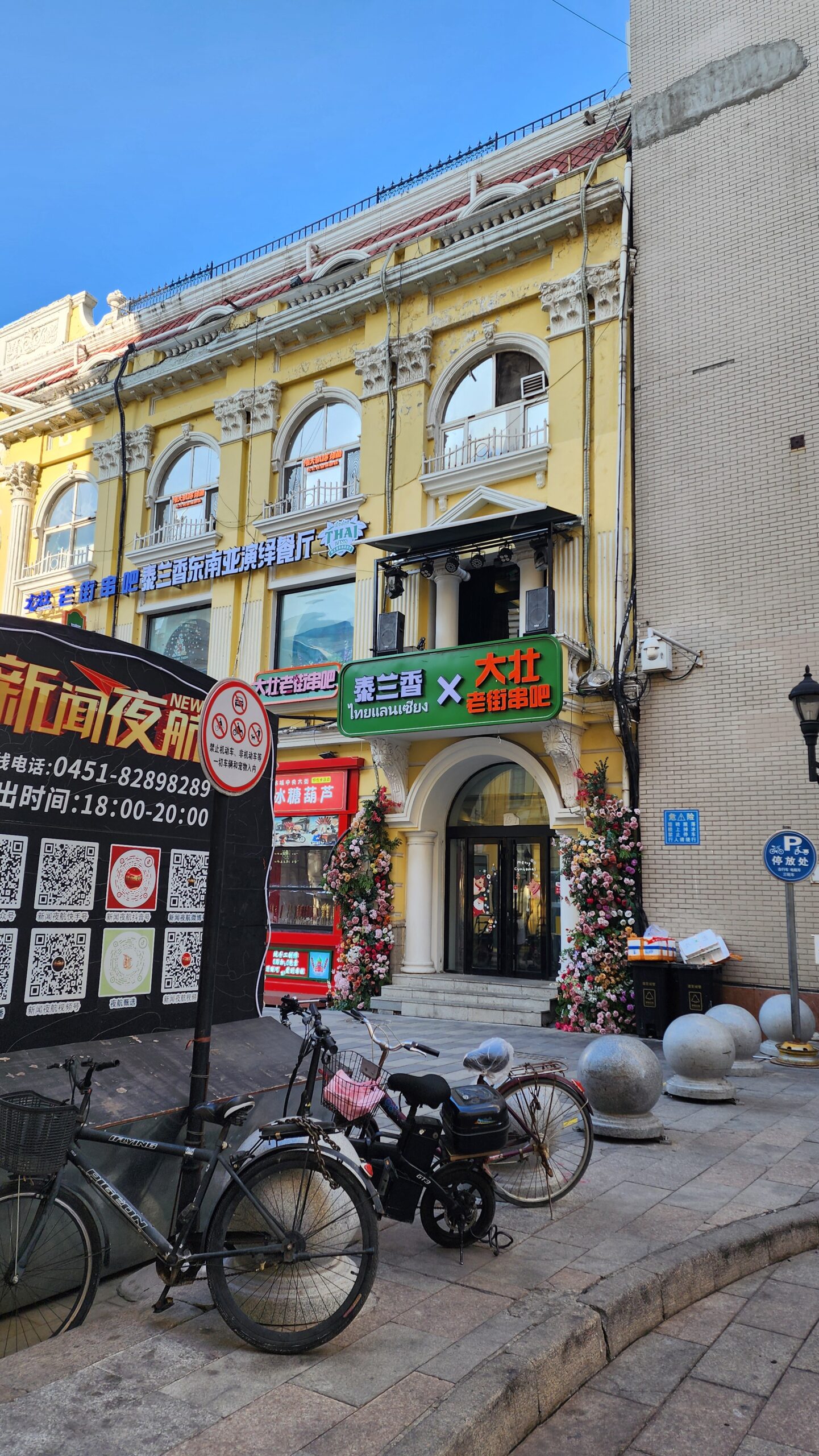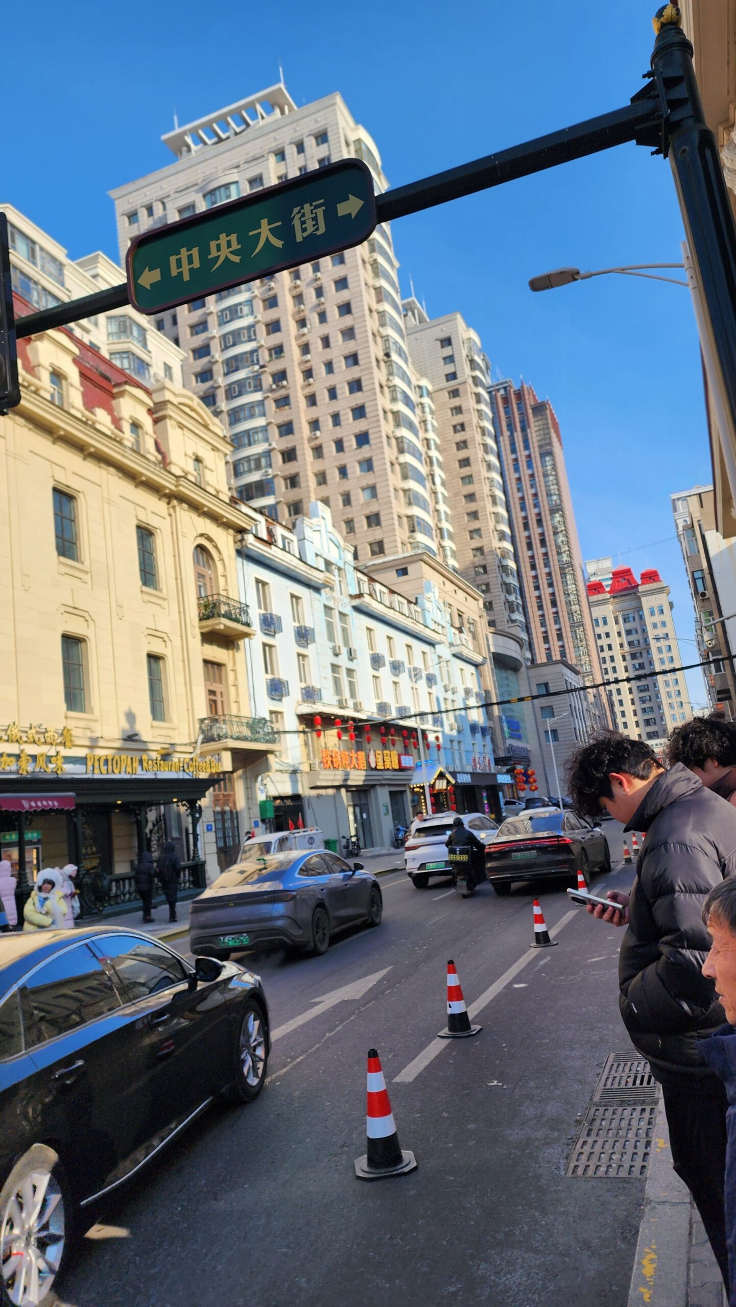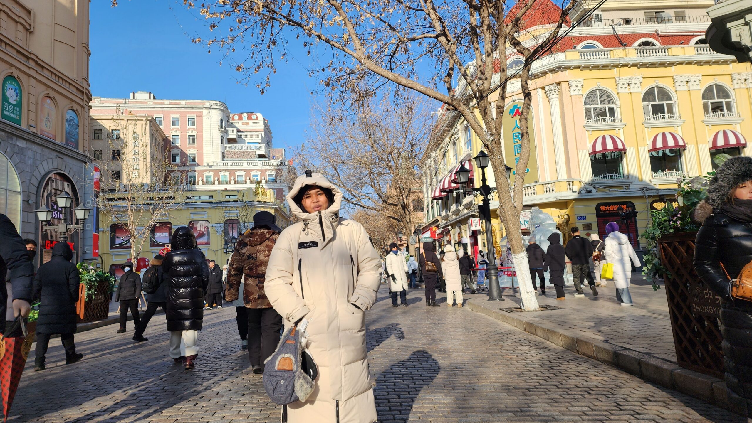 ถนนจงหยาง (Zhongyang Street / 中央大街) ถนนสายช้อปปิ้ง สองข้างทางเต็มไปด้วยร้านค้าห้องแถว สถาปัตยกรรมตึกเป็นแบบยุโรป ดูสวยงาม ผมไม่ได้ค้นว่าสร้างใหม่ หรือของเก่า แต่นั่นไม่ใช่ประเด็น เพราะผมมองเห็นผู้คนจับจ่าย เต็มถนนนักท่องเที่ยวเดินดู เดินเที่ยว เดินกิน เครื่องดื่มอาหารขบเคี้ยว เท่านั้นถนนก็มีชีวิตแล้ว ไม่แข็งกระด้างเหมือนตึกสูง บรรยากาศคล้ายสยามสแควร์ แถวปทุมวันในกรุงเทพ สวยทันสมัย แต่ที่นี่มีกลิ่นอายอดีตยุโรป