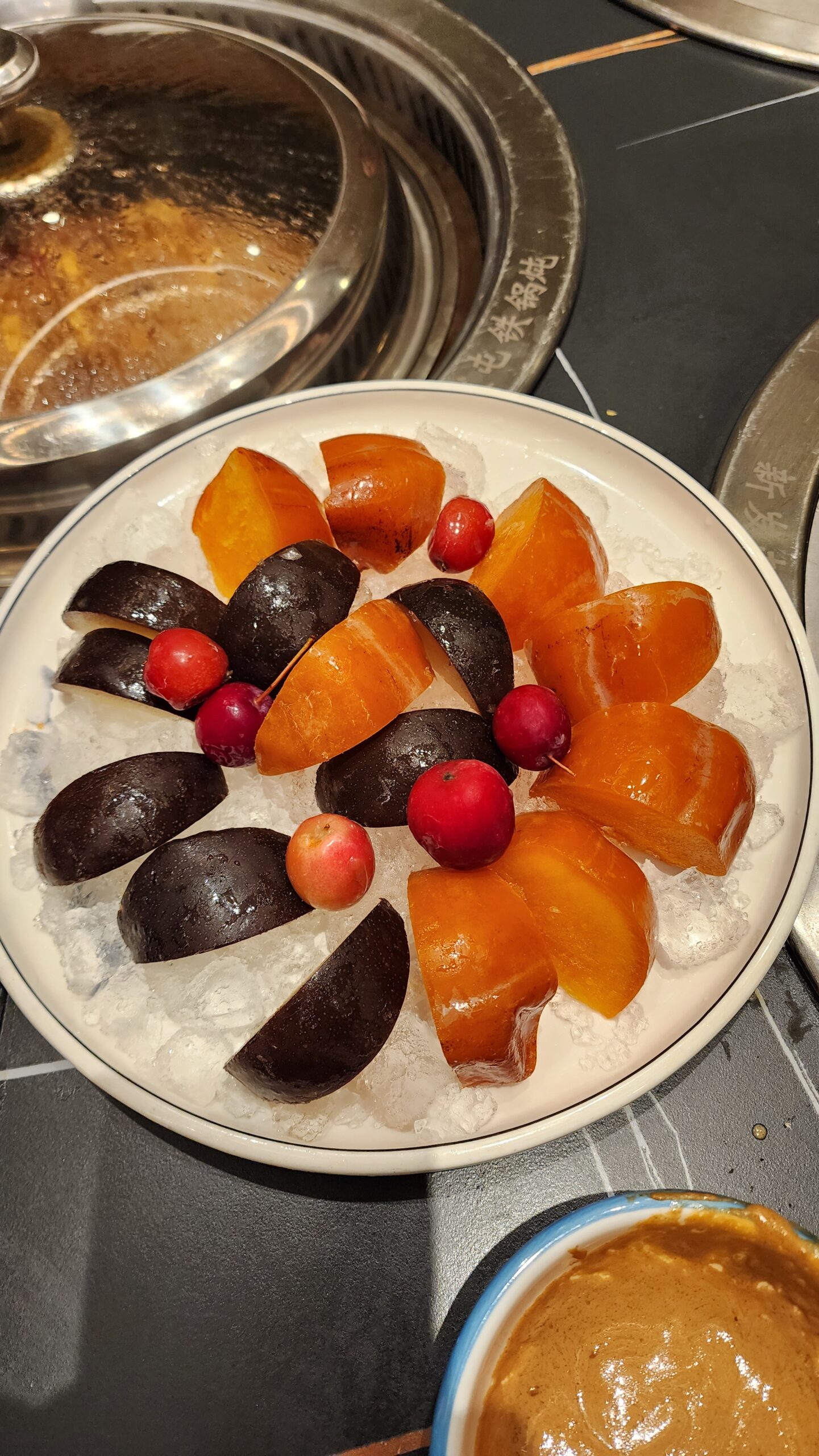 ผลไม้แช่แข็ง ลูกแพร์ ลูกพลับ แอปเปิ้ล (ของหวาน)ไม่ต้องเข้าตู้เย็นเพราะทุกอย่างมันแข็งอยู่แล้ว ด้วยอากาศ จานนี้เฉยๆ พวกเรามาจากเมืองร้อน ผลไม้สดให้กินเยอะอร่อยกว่าแน่นอน แต่จานนี้ร้านเสริฟให้ฟรี