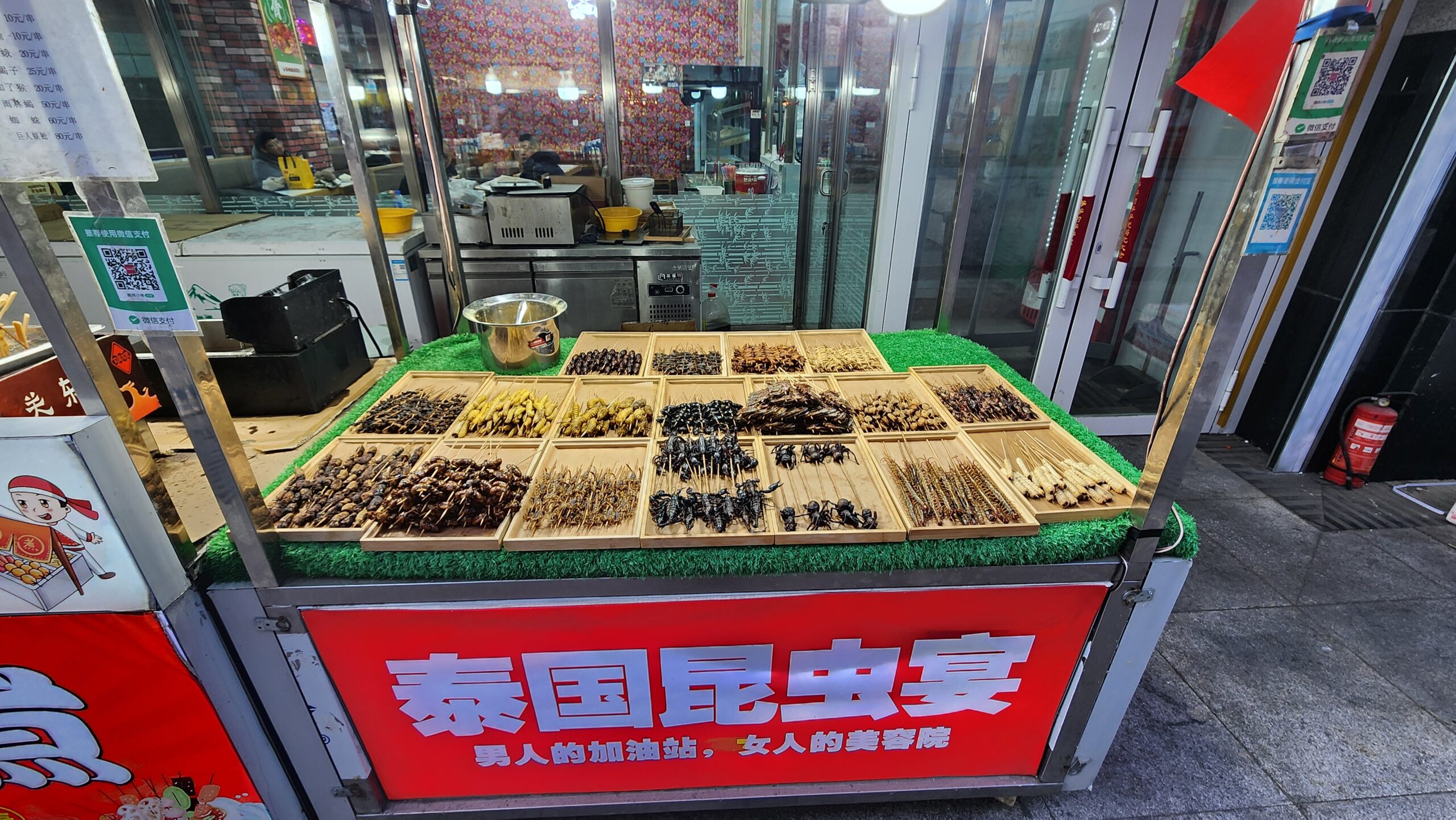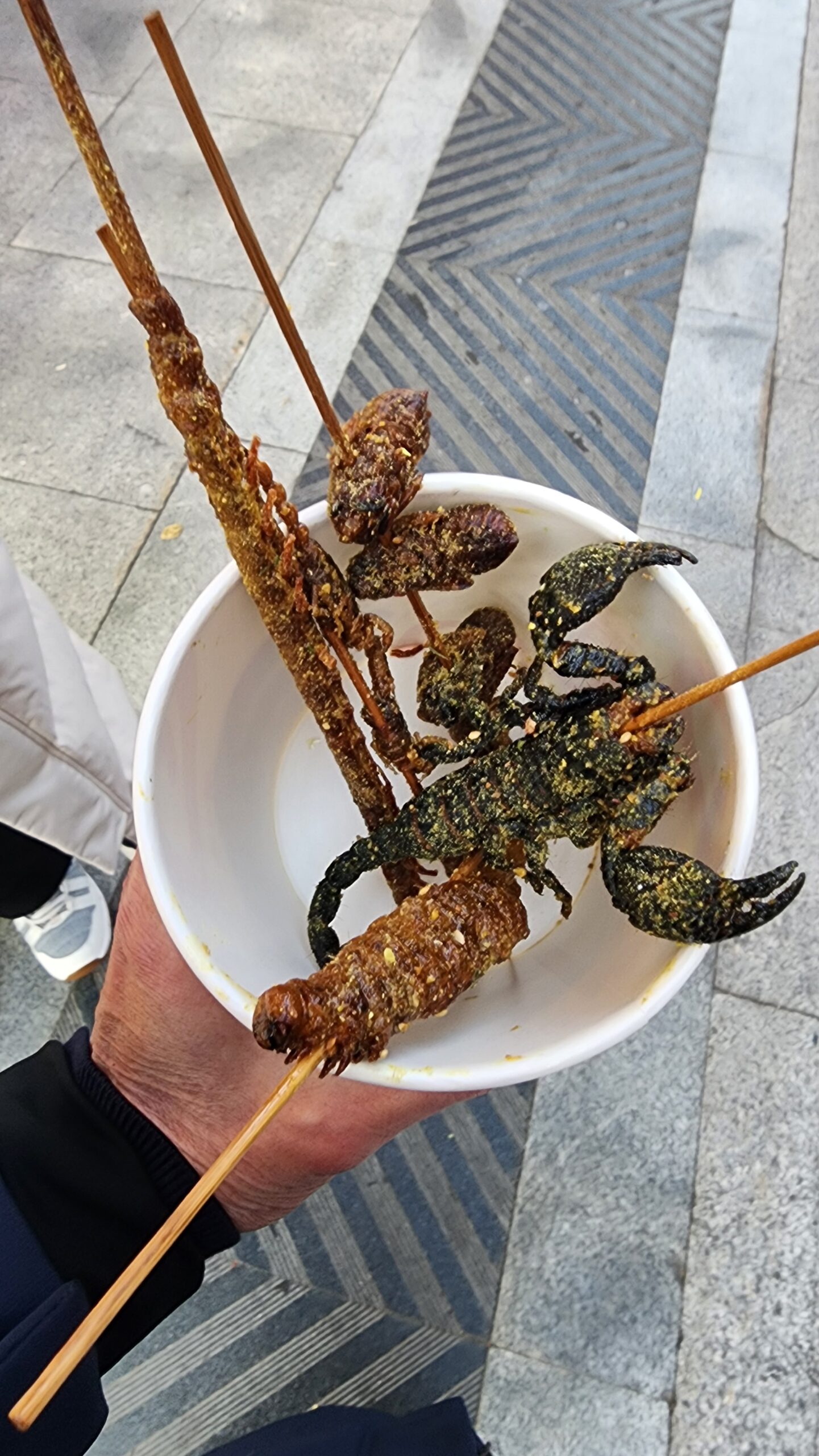 เดินวนอยู่หลายรอบ ซักพัก พลอย โทรหาผ่านไลน์ว่าอยู่ไหน บอกว่าเดินอยู่นอกห้างเขาอยากเดินด้วย คราวนี้ผมเดินไกลขึ้นเก็บบรรยากาศร้านริมทาง มาสะดุดร้านสุดท้ายขายแมลงทอด ถาม Chat GPT ภายหลังตอนเขียนบทความ ป้ายเขียนว่าอะไร ไท่กั๋ว คุนฉง เยี่ยน (แมลงทอดไทย) ตอนนั้นผมต้องลองกิน ปกติอยู่ไทยผมก็กินแมลงทอด ผมเชื่ออะไรที่คนอื่นกินได้ผมกินได้หมด แมลงเสียบไม้ทอด ซื้อมาหลายชนิดเอาแบบยังไม่เคยกิน แมงป่อง ตะขาบ ด้วงสาคู นอกนั้นกินมาหมดแล้ว รวมไม่กี่ไม้ 180 หยวน คูณ 4.5 อัตราแลกเปลี่ยนขณะนั้นจ่ายเงินไป 810 บาทแพงมั้ย ถ้าไปเที่ยวไม่แพงพร้อมมาก โดยเฉพาะแมงป่อง 80 หยวน สามร้อยกว่าบาท เคยเห็นขายบนเส้นทางอุบล ไปศรีสะเกษ แถวกันทรารมย์ แต่ไม่เคยซื้อกินตลาดข้างทางแถวนั้นย้ายไปแล้ว