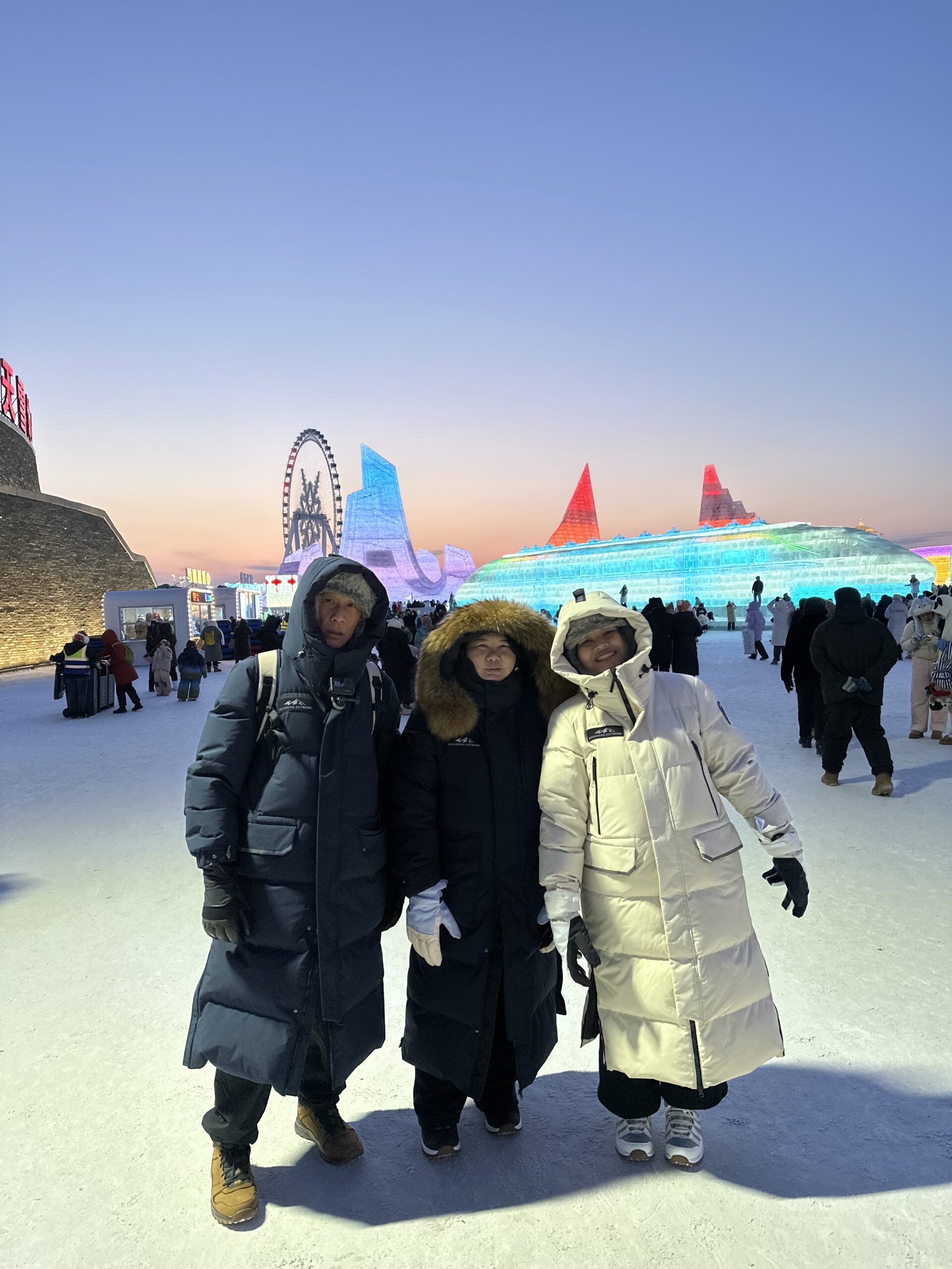 เดินทางมาเทศกาลน้ำแข็ง เขาจะตัดก้อนน้ำแข็งมาเลียงเป็นปราสาท ไกด์ลองภูมิผม ถามว่าก้อนน้ำแข็งเขาเชื่อมด้วยอะไร ผมบอกน้ำ ไกด์บอกถูกต้อง แหม ผมนี่ฉลาดไม่เบาเลยเนอะ สถานที่ท่องเที่ยวก็คือสถานที่ท่องเที่ยว ถ่ายภาพเก็บบรรยากาศเป็นที่ระลึกว่าเคยมา แสงไฟประดับทำให้สวยขึ้น แต่ตอนนั้นคืออากาศเย็นมาก ฟ้ามืดอยู่กลางแจ้งเวลานาน มีลม ถ้าเดินเฉยๆ ไม่เท่าไหร่เพราะมีอุปกรณ์ป้องกันตัวเพียบ แต่ในฐานะนักท่องเที่ยวต้องถ่ายภาพ อะไรถ่ายภาพสะดวกสุดโทรศัพท์ ส่วนกล้องแอ็คชั่นคาเมร่าแบบ Gopro ผมแขวนไว้ที่คอไม่ยาก สิ่งที่ยากคือ ต้องเอามือออกจากถุงมือหนาๆ เพื่อถ่ายภาพ นั่นคือนรกอยู่บนฝ่ามือ และนิ้ว พอเย็นแป๊บเดียวจะเจ็บมาก รีบถ่ายรีบเก็บโทรศัพท์ ยัดมือเข้าถุงมือ มีถุงทรายร้อนให้อุ่น ทำสลับกันไปมาไม่ถ่ายก็ไม่ได้ภาพ ถ่ายก็เจ็บมือเจ็บนิ้วแต่ก็ต้องแลกกัน จะสังเกตภาพผมไม่ได้ใส่แมส ไม่ใช่กลัวไม่เห็นหน้า แต่ชั่วโมงนั้นลืม ไม่รู้ไปยัดไว้ไหน ทั้งกระเป๋าเป้ และเสื้อกันหนาว ทั้งหนัก และเต็มไปด้วยช่องกระเป๋าค้นไม่ทัน ภาพตรงหน้าต้องรีบเก็บๆๆๆ จะได้ออกจากพื้นที่เร็วขึ้น
